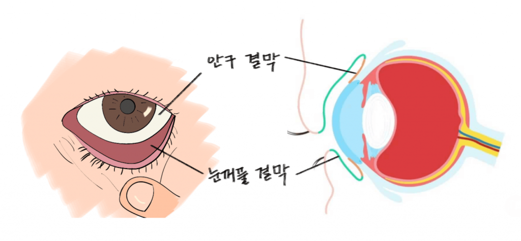 결막은 눈꺼풀 부분까지 이어지는데 평상 시에는 보이지 않지만 눈꺼풀을 내려 안쪽을 보게되면 마찬가지로 눈꺼풀 피부의 안쪽을 구성하는 점막 역시 결막에 해당된다.