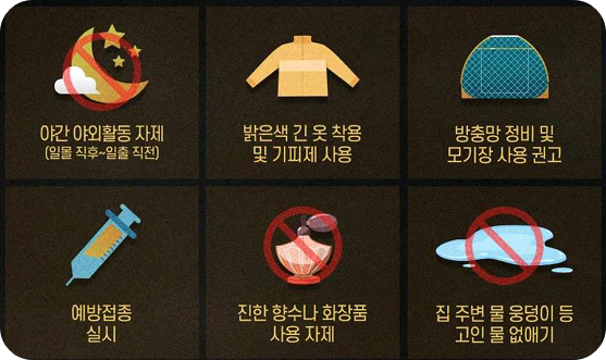 • 야간 외출 시 밝은 색 긴 옷, 품이 넓은 옷을 착용하고, 노출된 피부나 옷, 신발 상단, 양말 등에 모기 기피제 사용하기