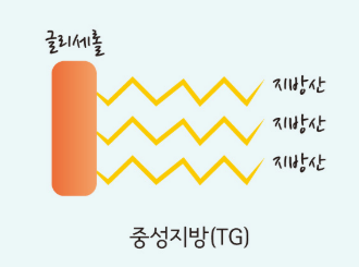 글리세롤 1분자에 지방산 3분자가 붙어 있는 형태로 지방산과 글리세롤이 결합한 화학물질이다.