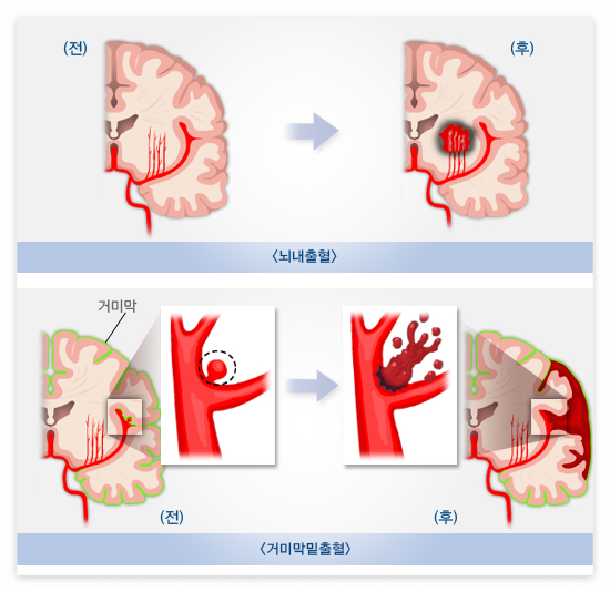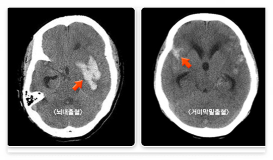 뇌출혈에는 뇌내출혈과 거미막밑출혈 등이 있습니다.