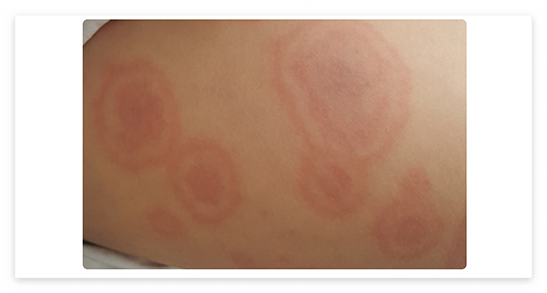 - 다형 홍반은 바이러스 또는 세균 감염, 약물에 대한 과민 반응으로 발생하는 발진이다. 피부에 표적모양 병변이 특징이다. 표적모양 병변은 중심부에 홍반, 부종성 원, 가장 바깥쪽에 홍반성 테두리 등 세 개의 층으로 나타난다. 단순 포진 바이러스 감염에서 흔한 것으로 알려져 있으며, 소아에서는 폐렴미코플라즈마 감염에서 흔히 발생한다. 대개 1~4주이내에 자연적으로 소실되나, 재발할 수 있다.