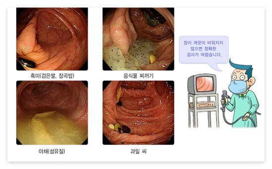 대장정결이 잘 되어 대장 내부가 깨끗하면 검사 시간이 단축되고 폴립 진단율이 높아지며 시술 관련 부작용이 생길 위험이 낮아진다. 하지만 장정결이 불충분한 경우가 많게는 25~30%에 이른다. 대장내시경 검사를 늦은 시간에 받을 경우, 입원 환자일 경우, 변비가 있거나 남성인 경우, 뇌졸중이 있거나 항우울제를 복용하는 경우, 비만한 경우 장정결이 깨끗하게 되지 않을 수 있다. 환자가 장정결제 복용법을 잘 지키지 않고 불완전하게 복용해도 마찬가지이다. 장정결제를 복용하기 전에 섭취한 음식물도 장정결 결과에 영향을 미친다. 음식 제한의 근거는 미약하지만 3일 전부터는 잡곡(흑미)섞은 밥, 깨죽, 김, 미역, 옥수수, 견과류와 수박, 참외, 키위 등 씨가 있는 과일을 먹지 않는 것이 좋다. 흰쌀밥, 죽, 식빵, 카스테라, 계란, 두부, 감자, 커피 , 녹차, 맑은 음료는 문제가 없고, 사과, 바나나 같은 과일도 먹을 수 있다. 검사 전 날 오후 6시부터는 물이나 맑은 음료수를 충분히 섭취해야 한다. 장정결제를 복용하면 식사를 해도 다 제거될 것이라 생각하고 음식을 많이 먹으면 검사에 지장을 초래한다. 외국은 식사문화가 우리와 달라서 검사 전 24시간 동안 맑은 유동식과 저잔사 식이 또는 저섬유식을 권장한다.