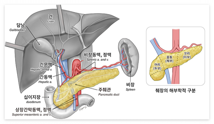 췌장이란 ; 이자라고도하고, 길이 약 15cm의 가능고 긴 장기이다. 십이지장을 통과할때 소화효소+이자액을 분비하여 혈당을 낮춰주는 인슐린&혈당을 올려주는 글루카곤 등 호르몬을 분비한다. 위의 아래쪽 쓸개 옆에 있고, 매우 깊숙해서 배가 가슴보다는 등에 가까운 쪽이다. 후복막(Retroperitoneum) 공간에 있다.