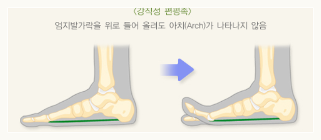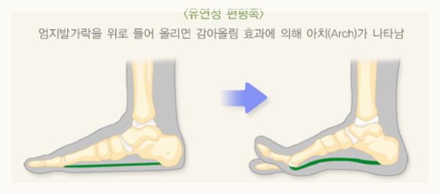 - 엄지 발가락을 위로 들어올려서 아치가 나타나면 유연성이라고 한다.