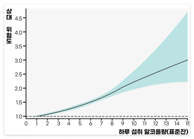 하루에 술을 전혀 마시지 않을 때 건강 위험이 최소화되고, 음주량이 늘어날수록 위험이 커진다.
