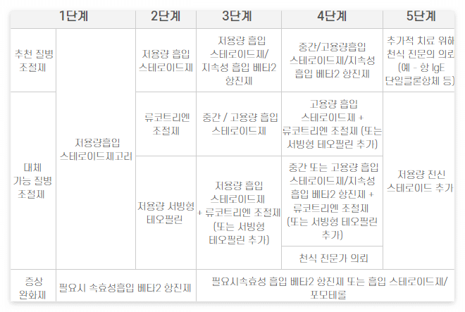 • 조절이 잘 되고 있다면 조절 상태가 유지되는 최소 치료 단계를 찾고, 반대로 조절이 안 되면 조절될 때까지 치료 단계를 높인다.