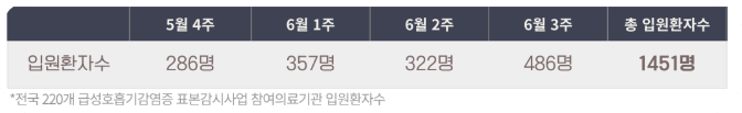 마이코플라스마 폐렴균 감염증이 유행시즌 24.6월에는 최근 4주 동안 1.7배 증가하면서 유행하고 있다. 주간 입원환자 수가 유행기준인 250명 이상 발생하여 지역사회 내 유행상황에 대비하기 위해 ;24년 6월 24일(월) 0시부터 마이코플라스마 폐렴균 감염증 유행주의보를 발령하게 되었고 올해 표본감시 참여 의료기관의 최근 4주간 입원환자수 1,451명 지난해 동기간 대비 약 8배 높은 185명인 상황이다.