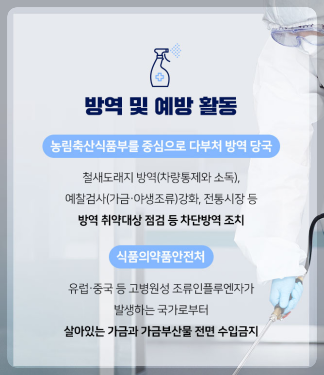 조류인플루엔자 인체감염 위험이 증가하는 상황에 대비 및 대응하기 위해 중앙 조류인플루엔자 인체감염증 대책반을 운영하고 원헬스 기반 범부처 대응체계를 강화하였다.