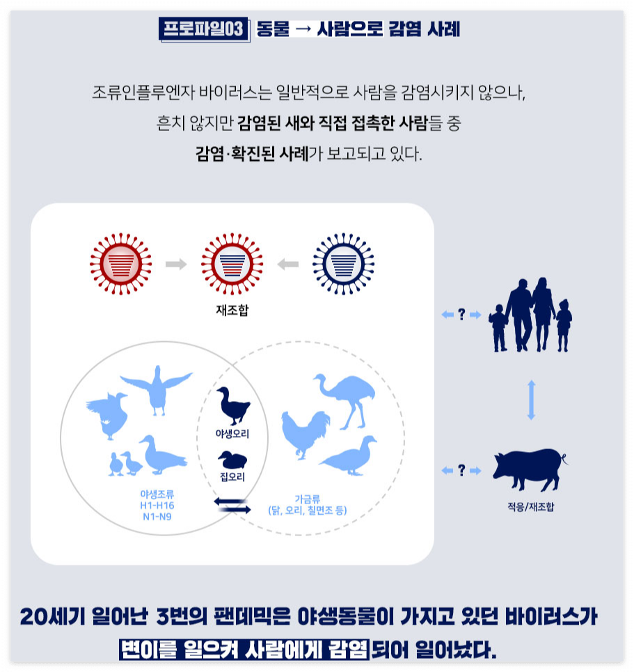 ⭐ 조류 인플루엔자(Avian Influeza A Virus)는 드물게 동물에서 사람에게 전파된다. (바이러스의 유전 물질이 돌연변이를 일으키는 경우 사람에 대한 전파가 발생할 수 있다.)